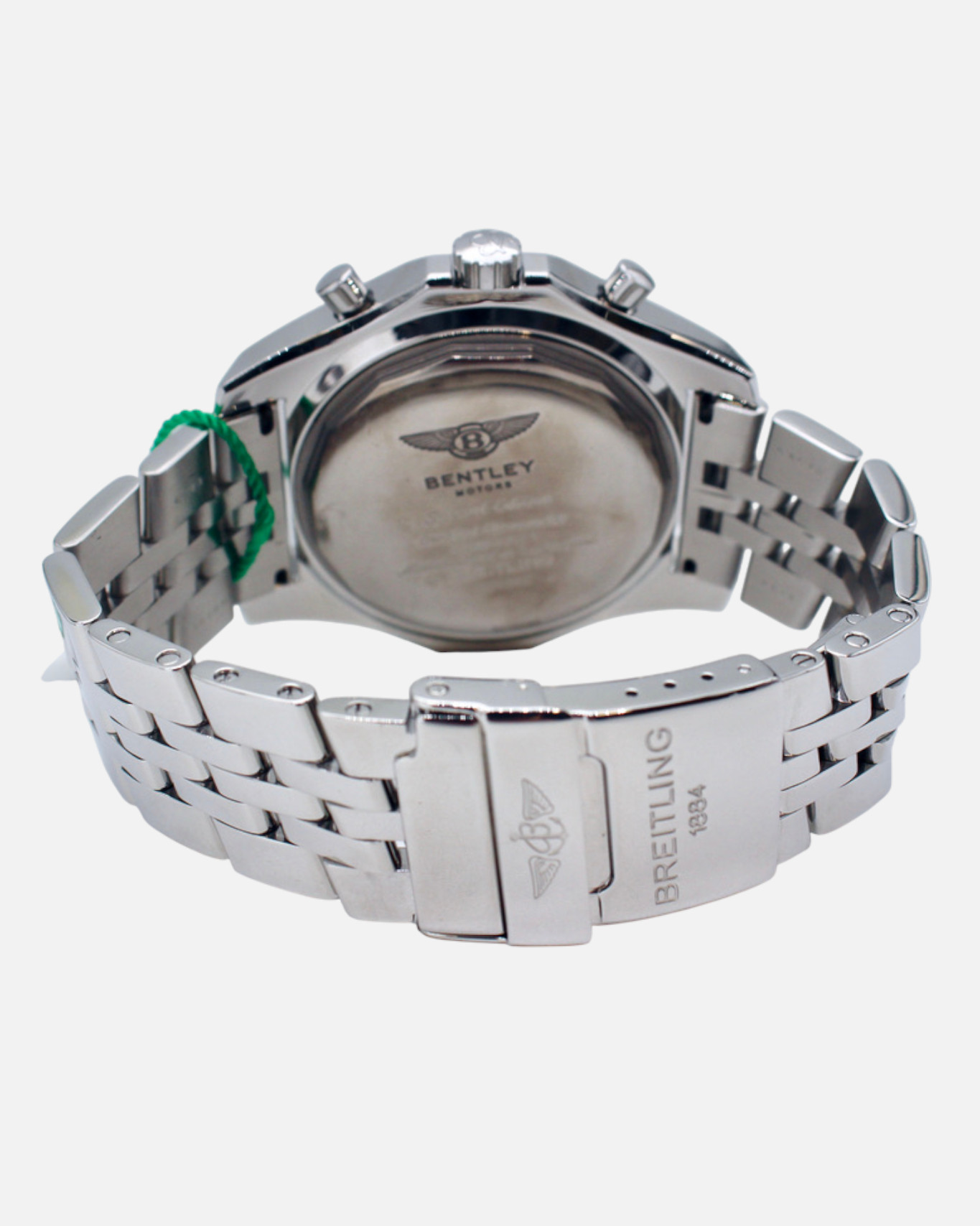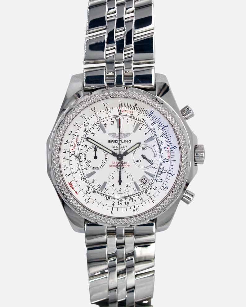 The white dial features intricate textures and high-contrast chronograph subdials, echoing the design cues of Bentley’s iconic dashboards. Equipped with a high-performance automatic chronograph movement, it offers exceptional accuracy, robust functionality, and the distinctive flair that defines the Breitling for Bentley collection.