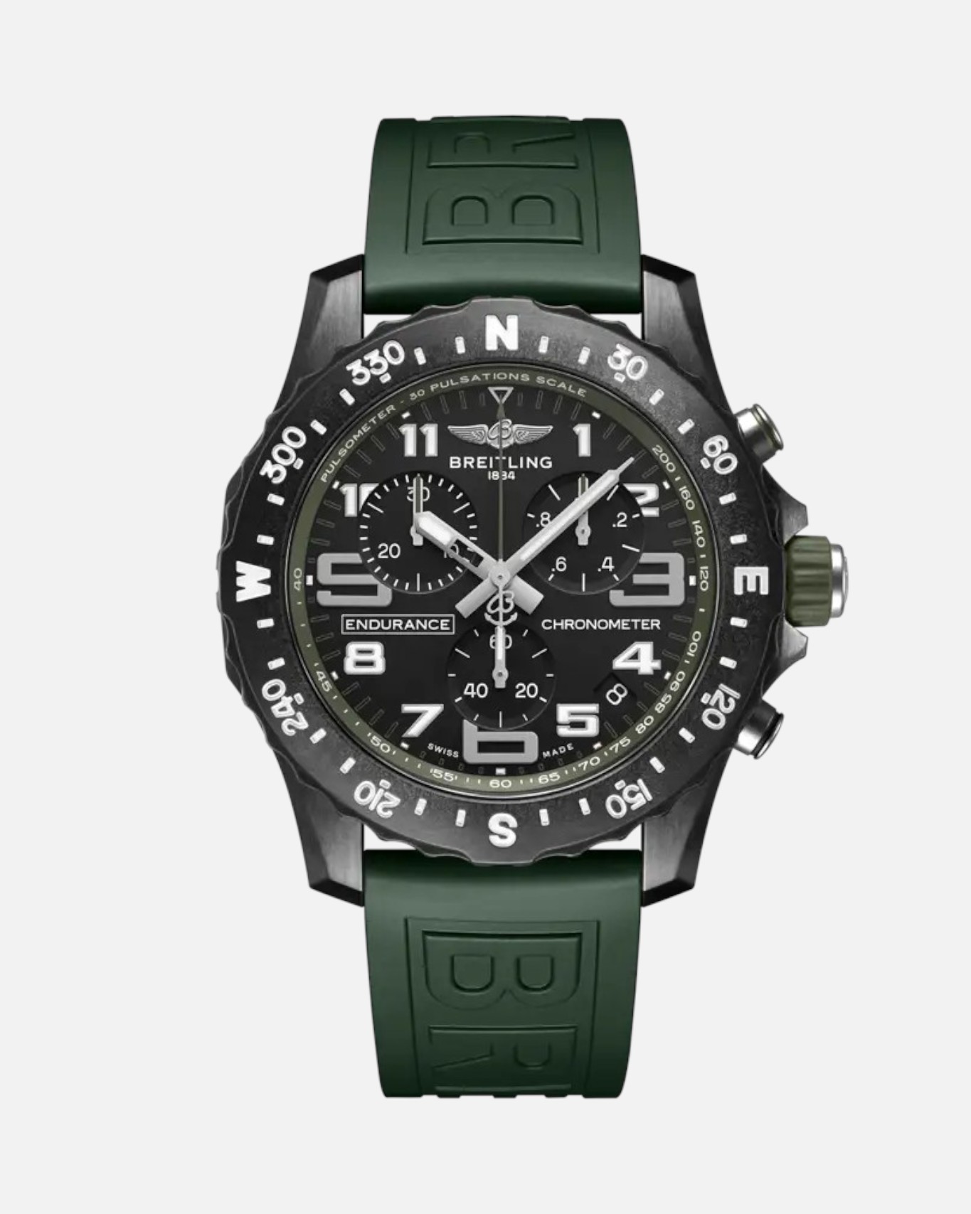 The Breitling Endurance Pro Ref. X82310 is a modern sports chronograph designed for athletes and adventure seekers who demand both precision and comfort. Crafted from Breitling’s innovative Breitlight® material, the case is exceptionally lightweight yet highly resistant to scratches, corrosion, and thermal changes, making it ideal for active wear. At 44mm, the watch offers strong wrist presence while remaining comfortable due to its featherweight construction and durable military green rubber strap.
