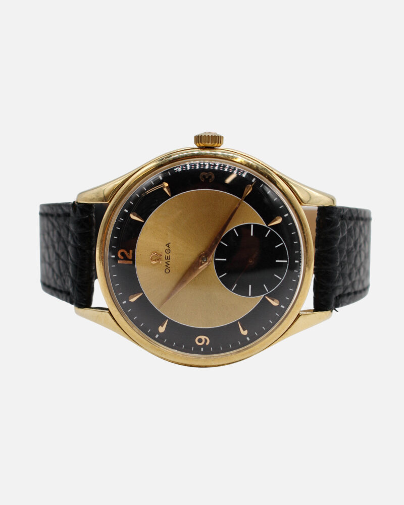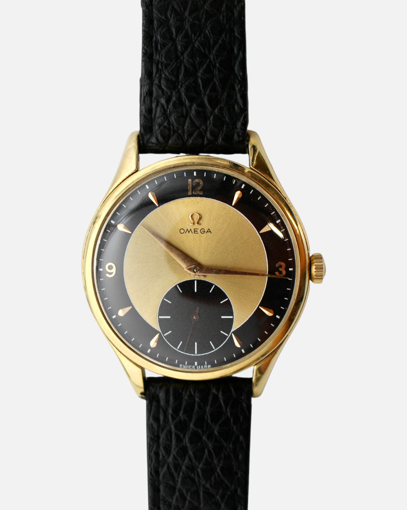 This remarkable 1950s Vintage Omega Ref. BK2505-5 is a standout example of the brand’s oversized “Jumbo” dress watches, celebrated for their bold mid-century proportions. Its beautifully restored two-tone bullseye dial has gold and black with gilt indices and small seconds offering exceptional visual depth and vintage character. The substantial 38mm gold-plated case wears with real presence, making it a highly sought-after reference among collectors. Powered by Omega’s hand-wound Caliber 265, this piece delivers classic mechanical charm wrapped in refined elegance. Presented in excellent condition, with an acrylic crystal, original signed crown and Omega buckle, it is a timeless addition to any vintage collection.