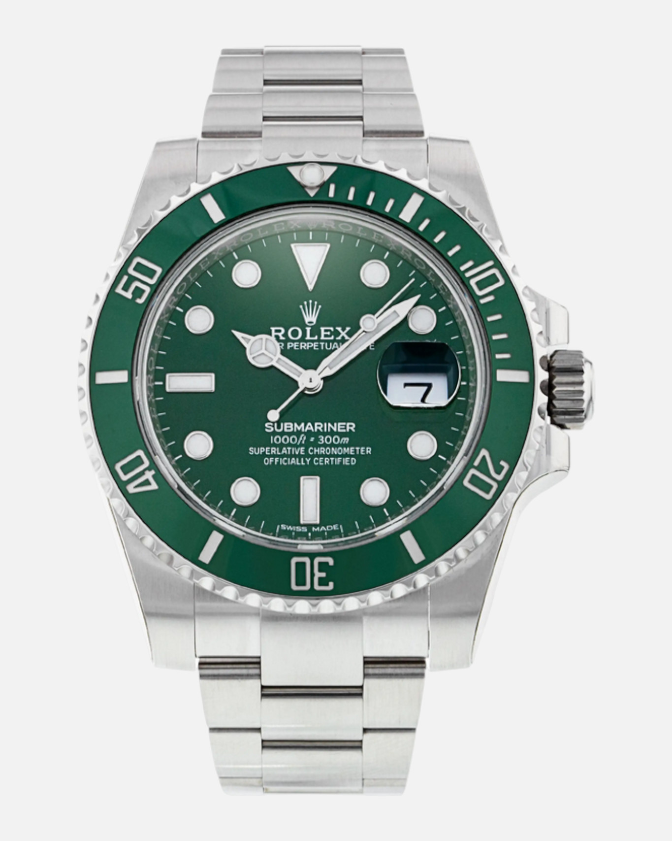 Crafted from Rolex’s proprietary Oystersteel, the 40 mm case delivers the robustness expected of a professional dive watch, while maintaining excellent balance and comfort on the wrist. The green ceramic bezel is a standout feature in its own right: highly resistant to scratches, fading, and corrosion, it retains its glossy finish and deep colour even with regular wear. Paired with the solid Oyster bracelet and Glidelock clasp, the Hulk is as practical as it is striking, allowing for easy adjustment and everyday versatility.